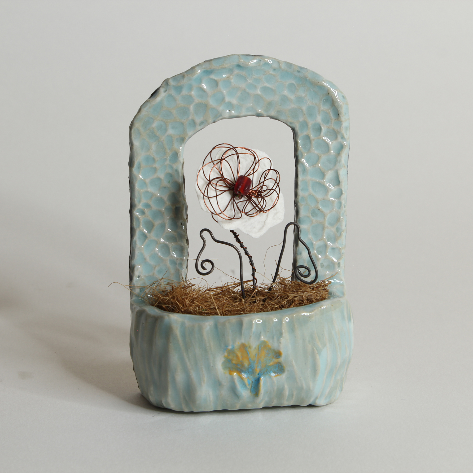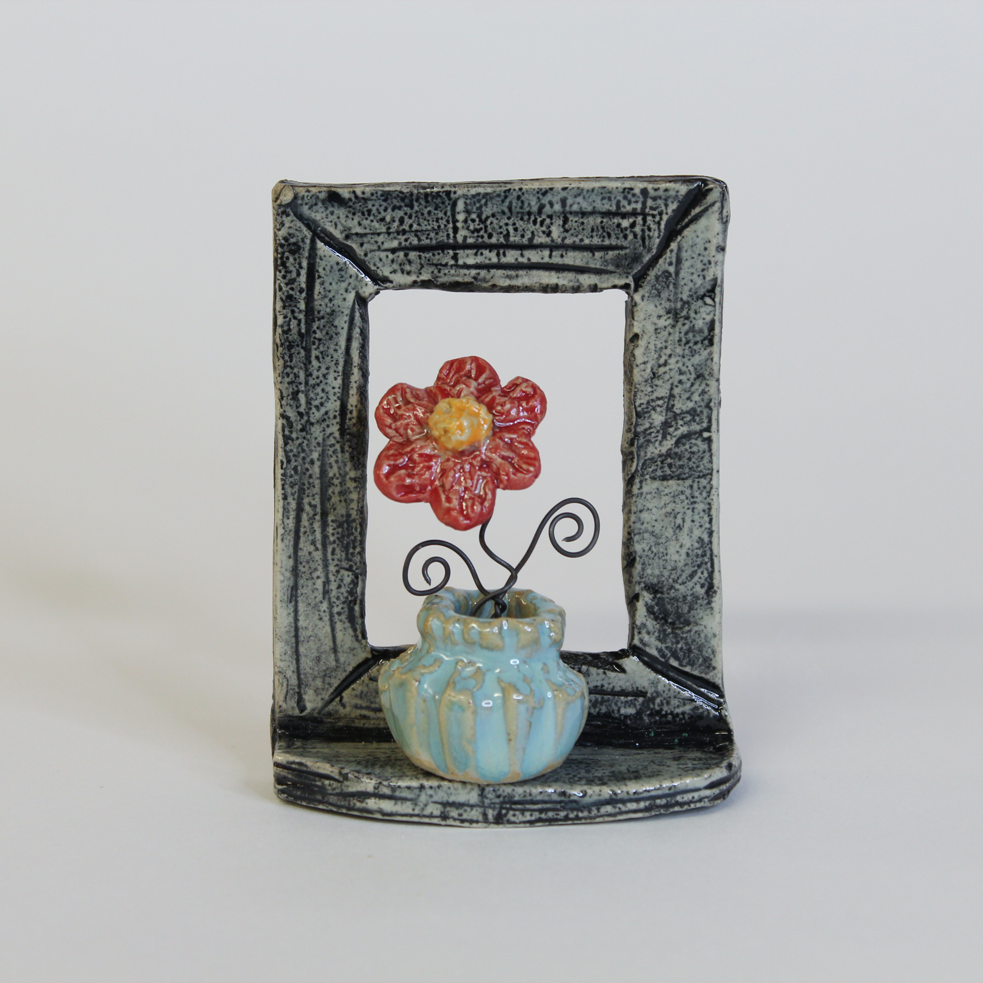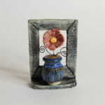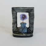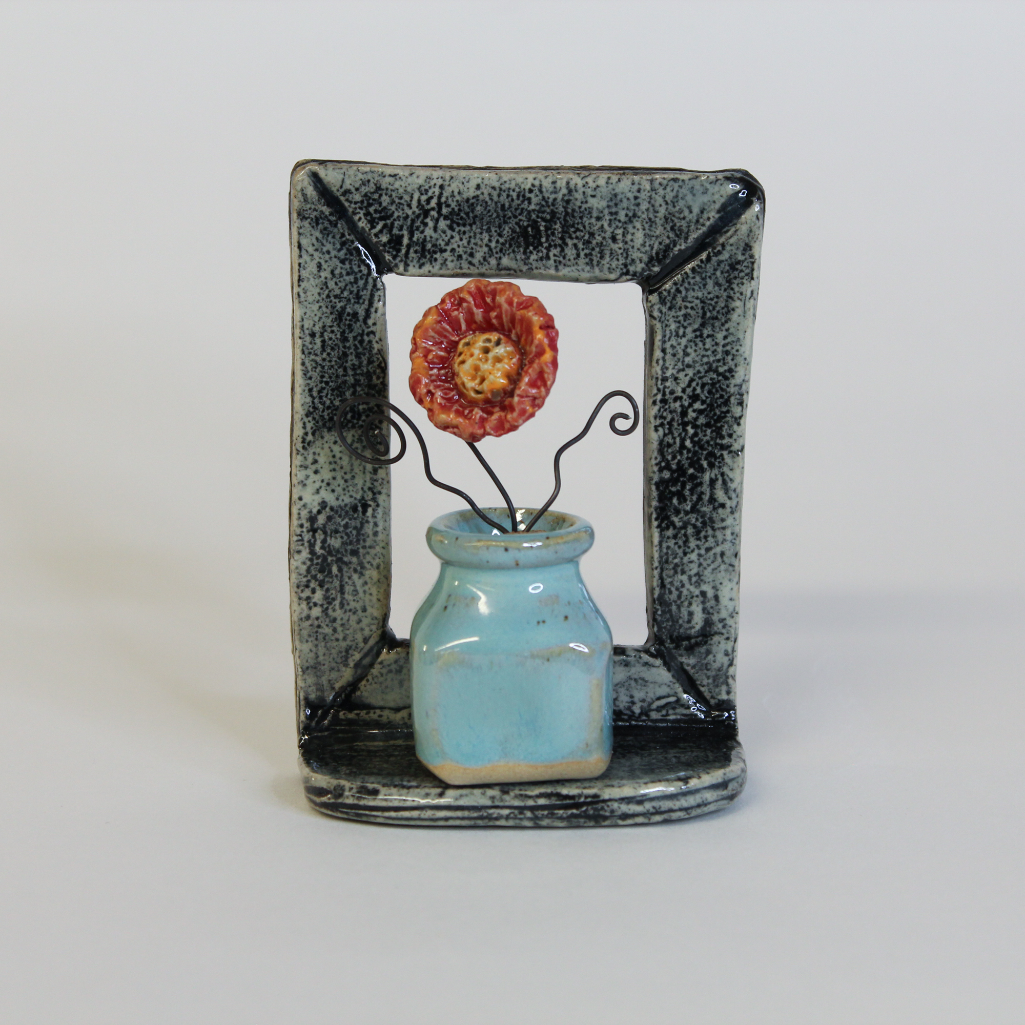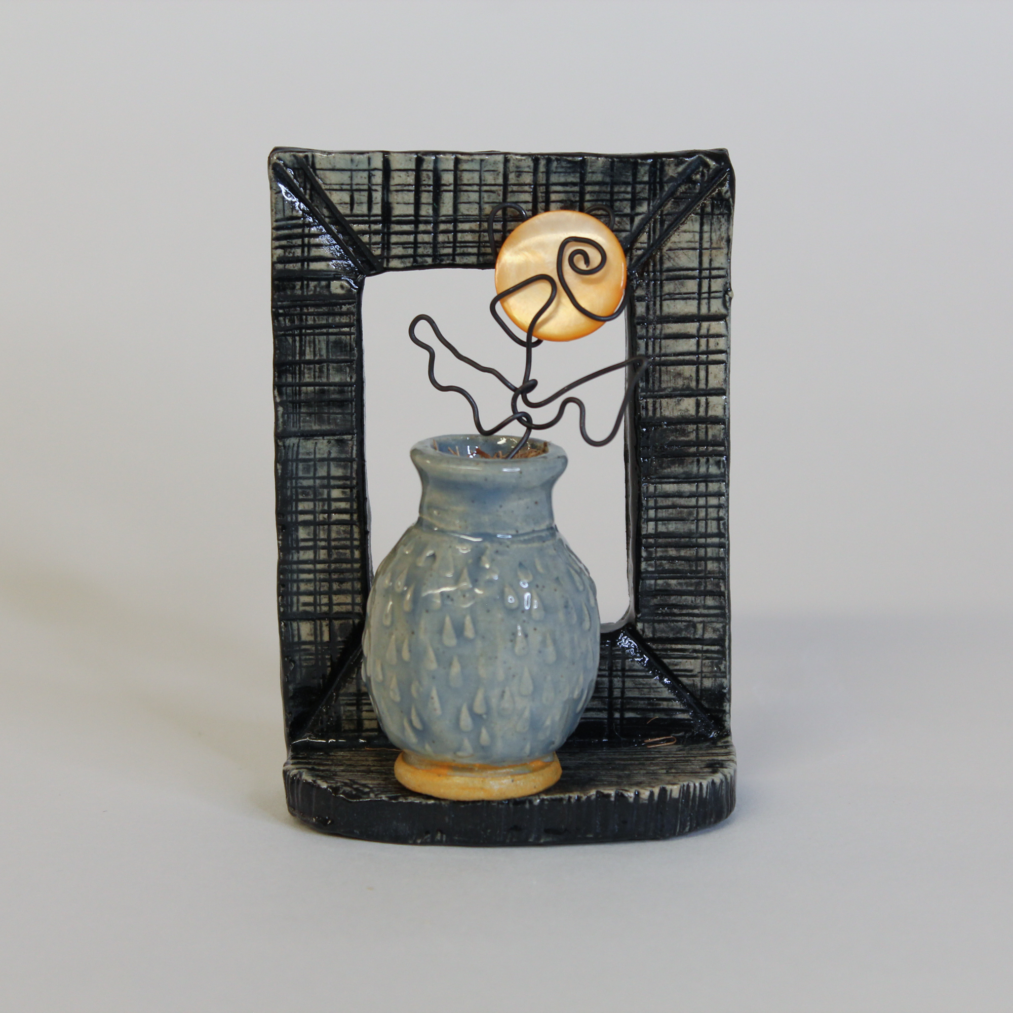 These works are inspired by a walking tour of the Cotswolds that my husband and I took last fall. Each morning, I appreciated the miniature bud vases that brightened the inns’ tables. As we hiked through the villages, I was captivated by the aged stone architecture and the vibrant blooms spilling from window boxes. Those impressions guided my creations. I wheel-threw and textured the vases, slab-built and underglaze-finished the window elements, then joined each flower with wire to create playful petals and stems. Through this work, I hope to share a little of the charm and joy of village life.