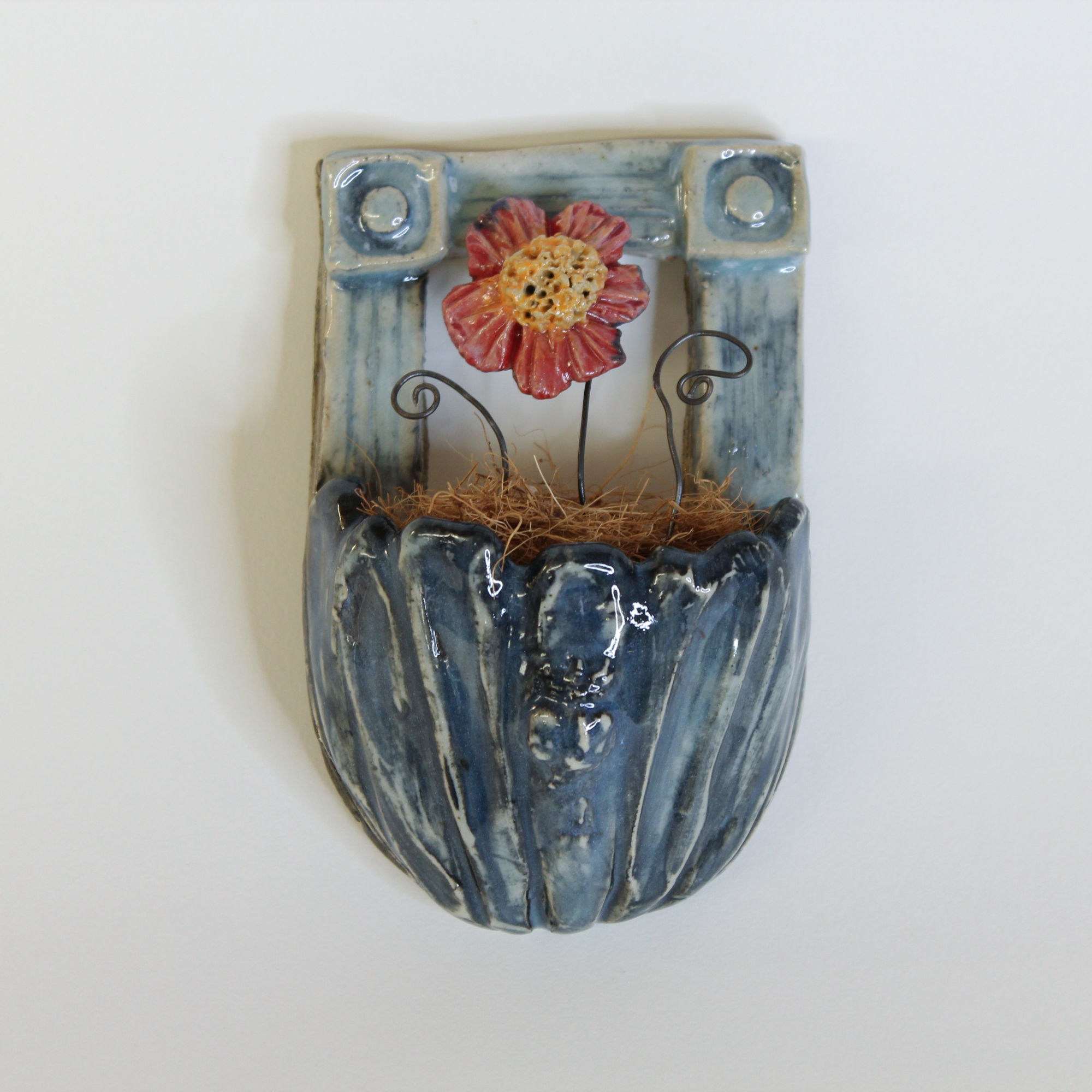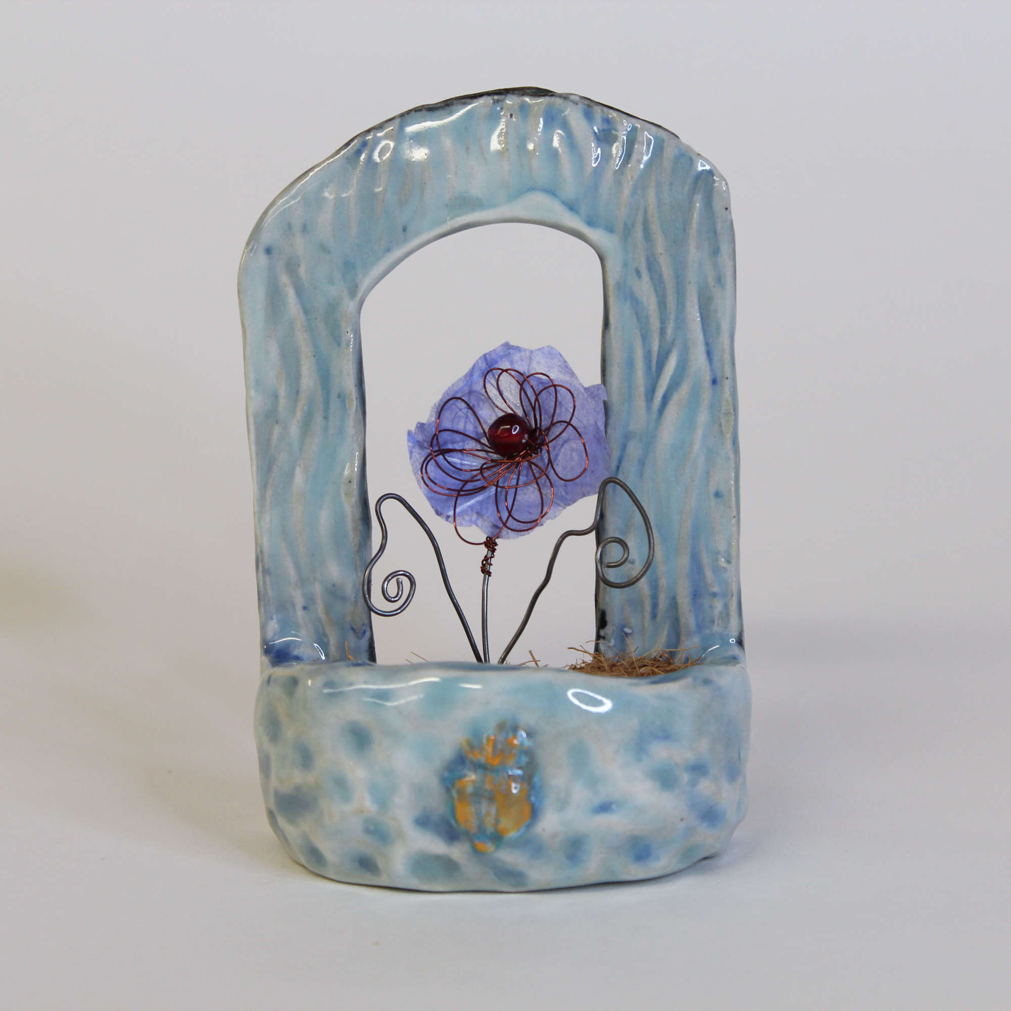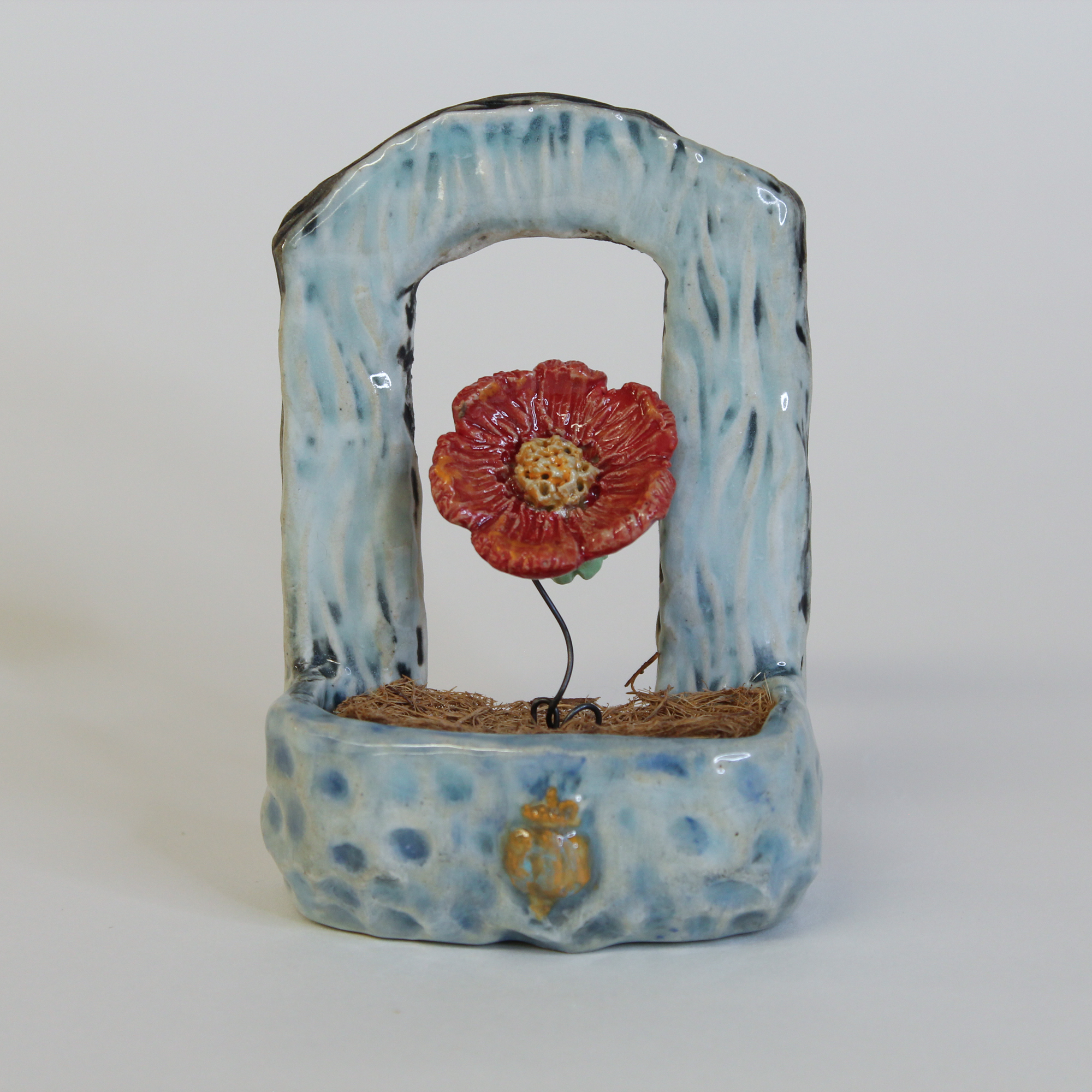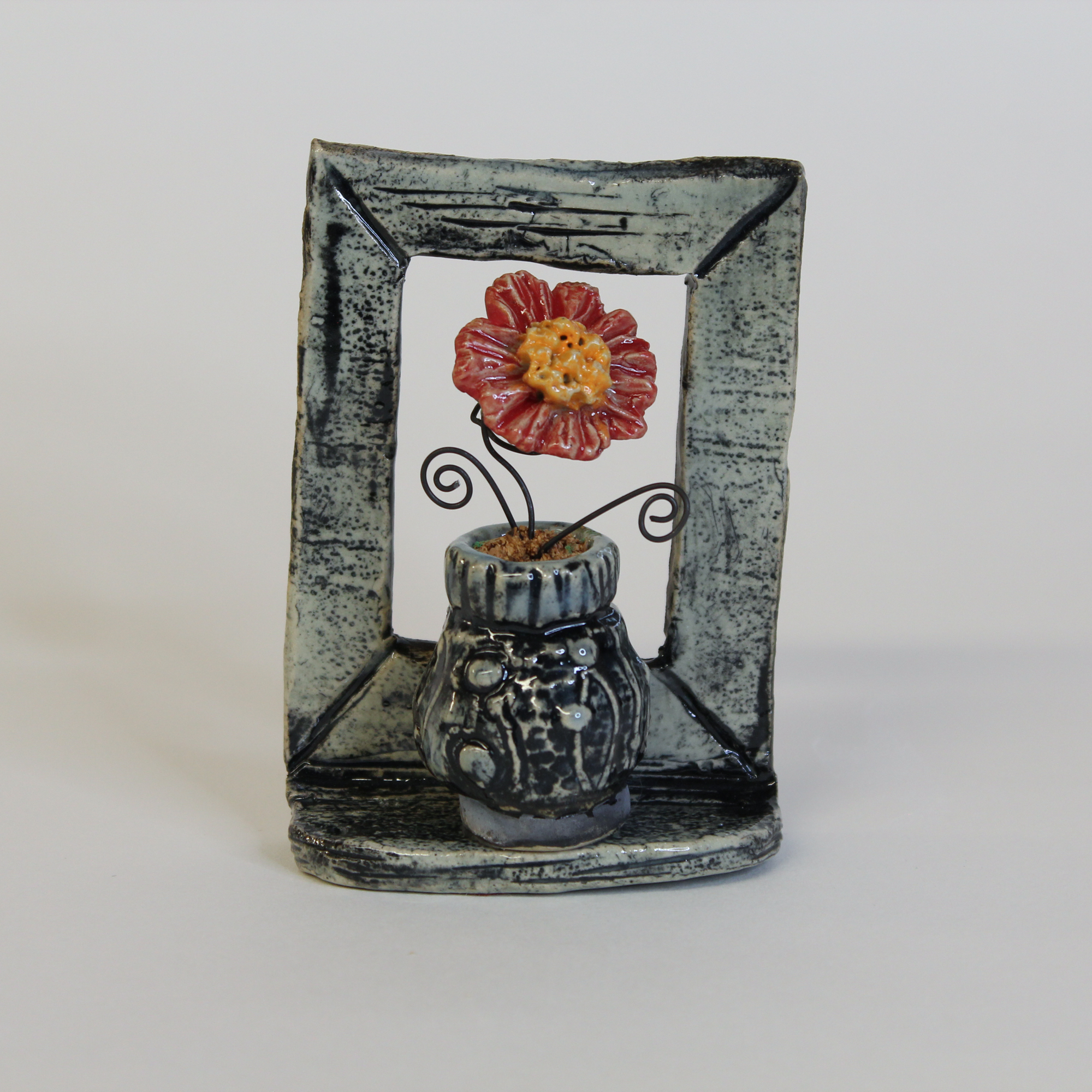 These works are inspired by a walking tour of the Cotswolds that my husband and I took last fall. Each morning, I appreciated the miniature bud vases that brightened the inns’ tables. As we hiked through the villages, I was captivated by the aged stone architecture and the vibrant blooms spilling from window boxes. Those impressions guided my creations. I wheel-threw and textured the vases, slab-built and underglaze-finished the window elements, then joined each flower with wire to create playful petals and stems. Through this work, I hope to share a little of the charm and joy of village life.