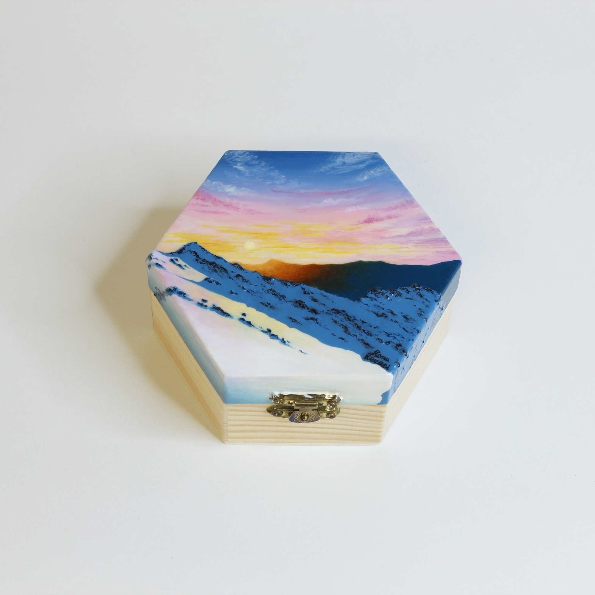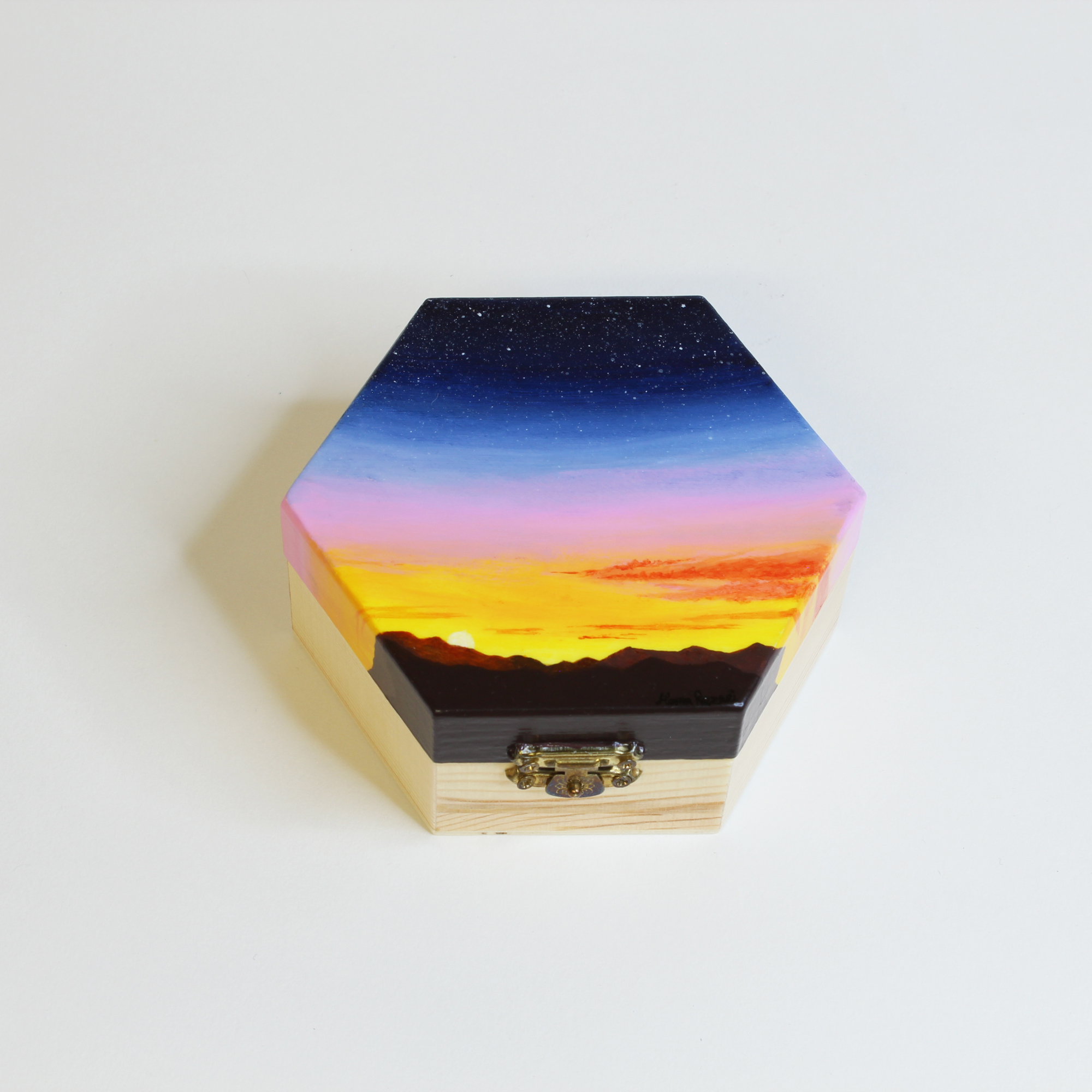 I am continually inspired by our serene and colourful natural environment and strive to capture a portion of this vast, magical world through my paintings. Working from photographs and using limited colour palettes, I painted this series of acrylic landscapes on wood boxes, which are both decorative and functional.