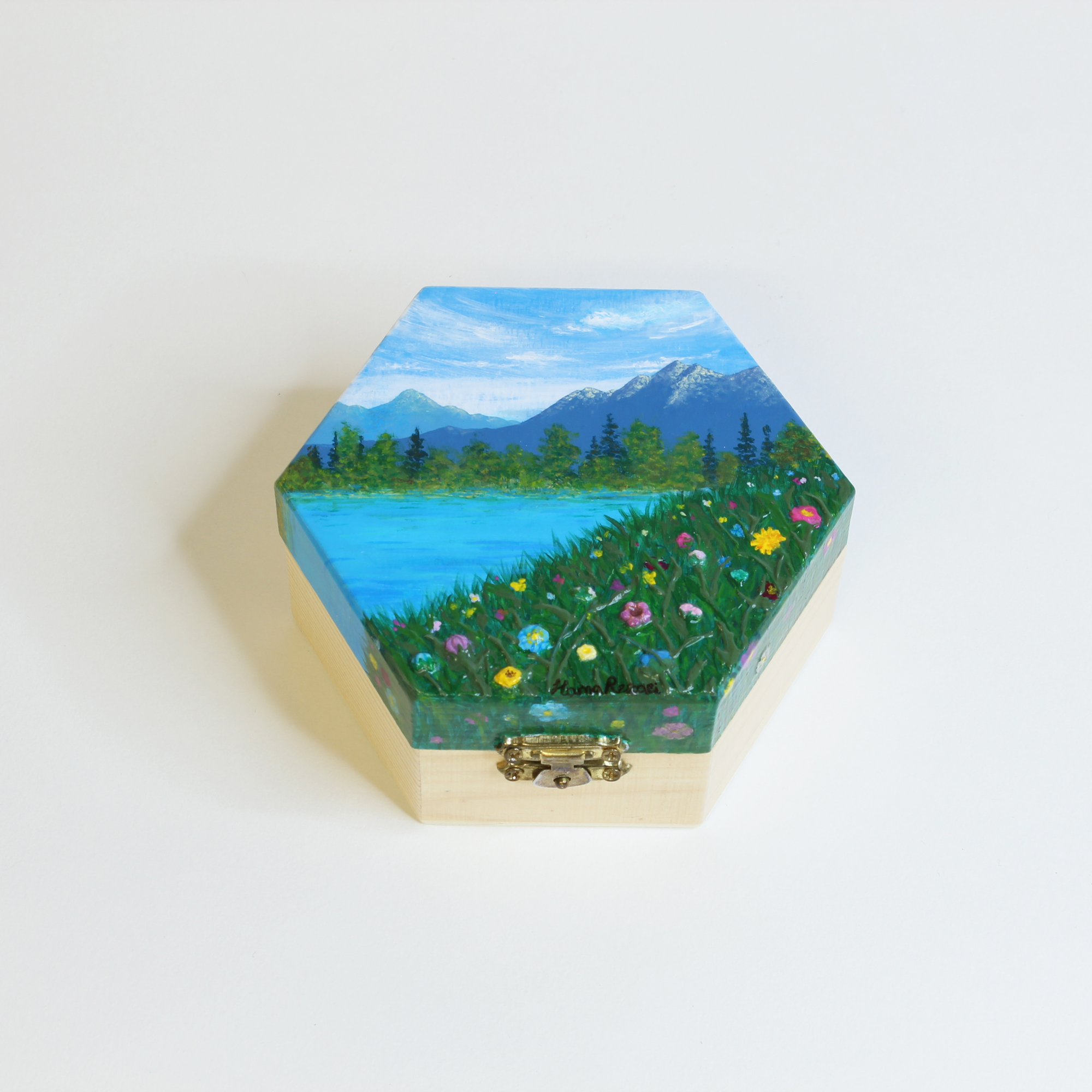 Through these hand-painted boxes, I’ve attempted to create a moment of bliss in our otherwise rushed and busy lives when one can be immersed in the beauty, calm and exuberance of nature. I believe painting is meditative for both the painter and the viewer, and I hope my paintings convey optimism, peace and tranquility.