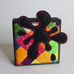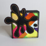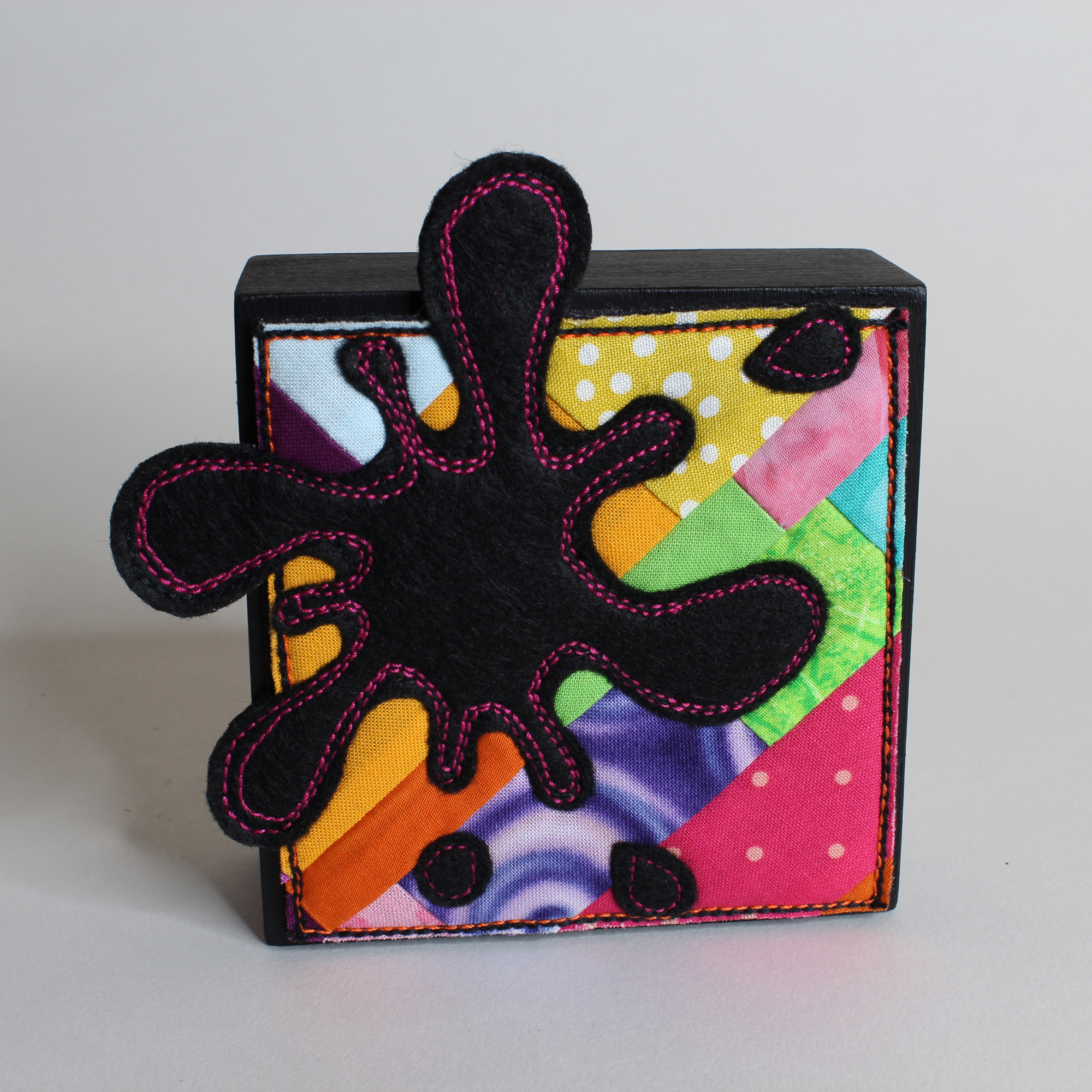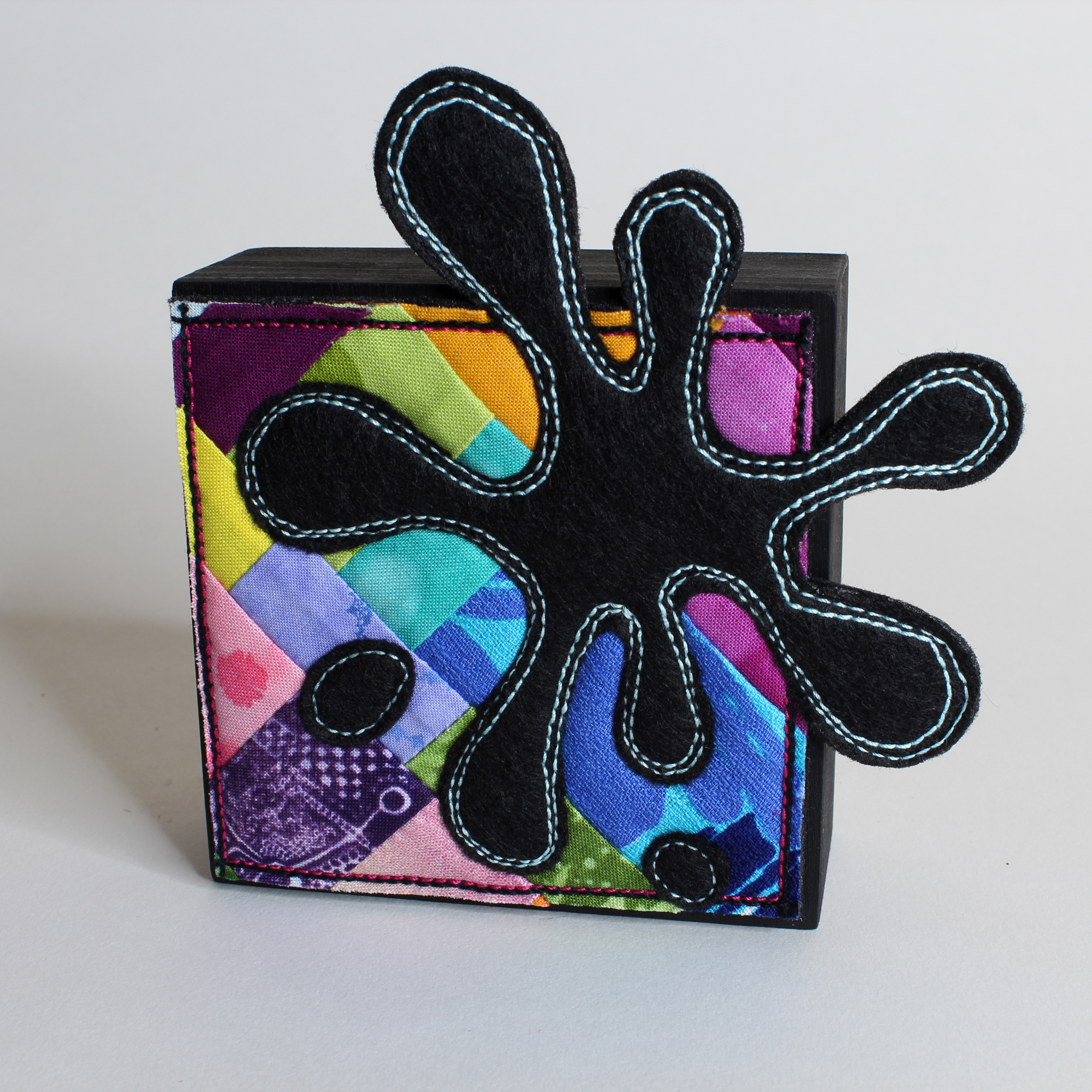 I sewed a selection of brightly coloured fabrics onto felt to form the background and then stitched unique felt “splats” to each piece.