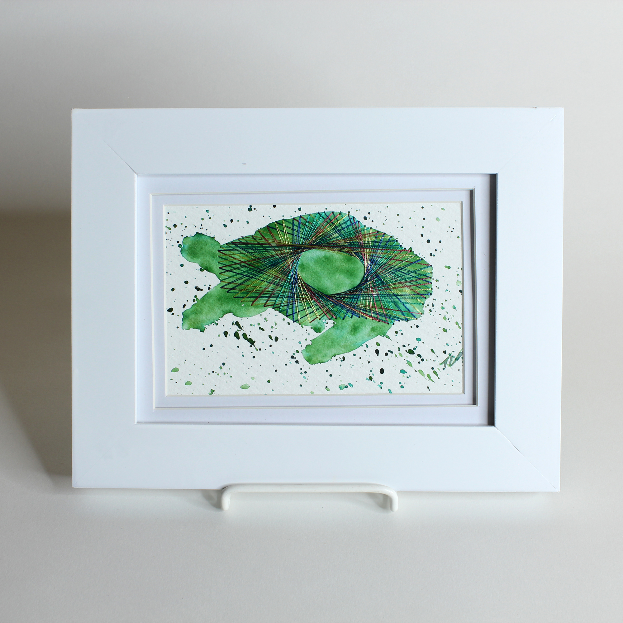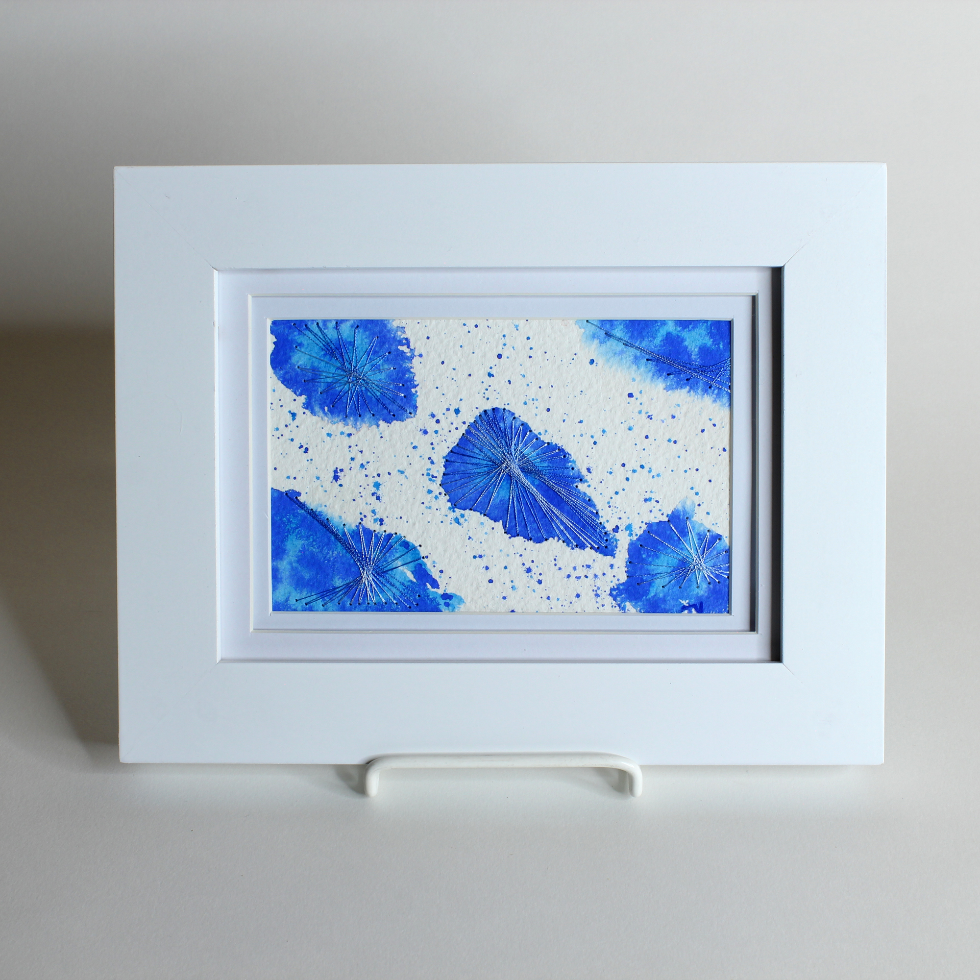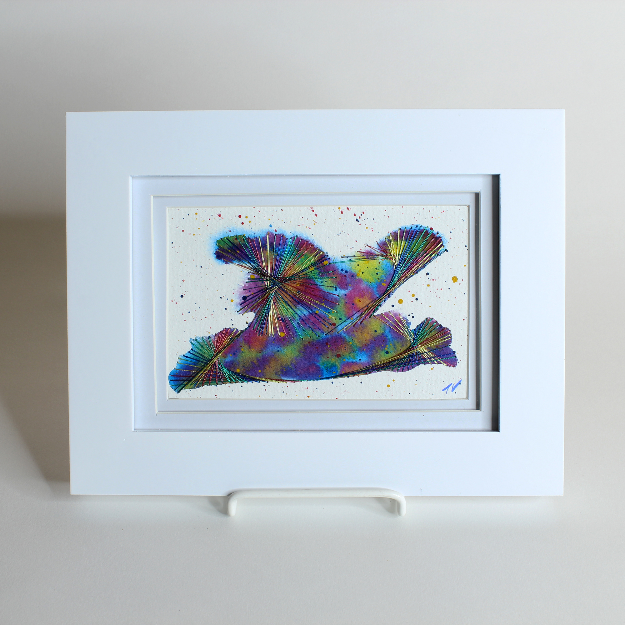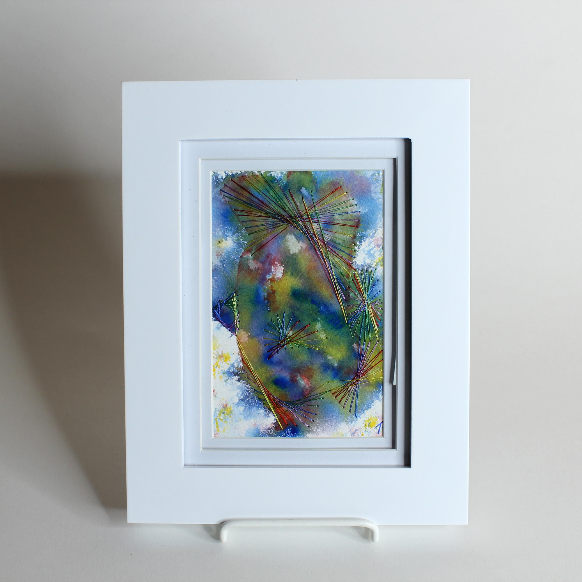 With those wonderful images in my head, I am now exploring the combination of watercolour with my first love of needlework. Using my sewing machine and space dyed rayon thread, I hand turn each stitch. There is no pre-conceived notion of where the next stitch is going to go. Like those far off galaxies, the colours go where they want to go. The magic is when the painting dries and the final stitch is made.